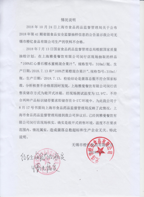 本次上海食药监局抽检的果汁微生物超标事宜,经我司和上海/无锡食药监共同调查,此次抽检门店销售的2批次日期果汁的问题并非由生产过程和产品品质缺陷造成,而是由终端销售门店储藏温度不达标所致。由于斐素的所有果汁均采用100%水果鲜榨而成,不添加任何防腐剂及其他添加剂,需要严格存储于0-5度的环境之下,才能保证鲜果的口感和营养成分,这也是斐素一直严选优质渠道和门店进行销售合作的原因。