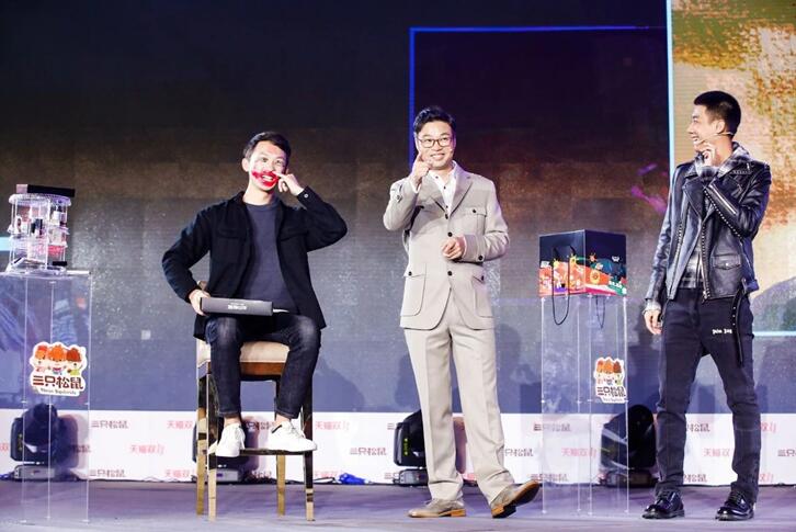 在电影综艺秀中,三只松鼠创始人、CEO章燎原饰演造物者,艺人、主持人、参会嘉宾则分别饰演猎人勇士、助手及吃货。真人现场演绎正片电影,在战胜重重困难通关后,成功解锁宝藏,将11款新品零食以新颖别致的方式呈现在观众眼前。
