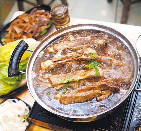 说起羊肉煲,其实贵州也有,其精髓在于那一锅汤。必须要用大锅来煲,肉味才香。熬汤的同时,还要放入特制的香料药材包,令羊骨汤香而不膻。搭配羊骨汤的是羊肋排,它与羊肉汤一锅煮出,肉煮得酥而不烂,嫩滑入味,虽有肥油,却丝毫不腻,加上花椒粉和海椒面,撒上新鲜的香菜,蘸着羊排吃,鲜香度立即提高。