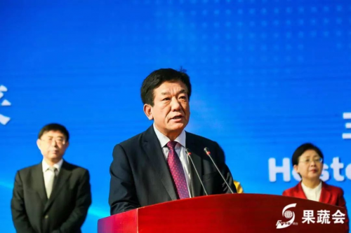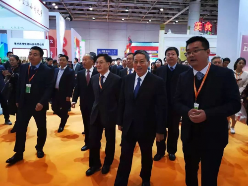 国际果蔬会组委会负责人贾鹏洲总、马玉柱总陪同中国科学技术部原党组成员、秘书长、国际欧亚科学院院士张景安,山东省商务厅副厅长王洪平,中共烟台市委书记张术平等领导参观展会现场并介绍展会基本概况。