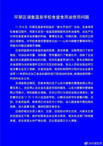 通报透露,在调查取证期间,环翠区教育局约谈了山东兴顺餐饮管理有限公司主要负责人,决定停止该企业在温泉学校的服务。山东兴顺餐饮管理有限公司表示,将积极配合调查,并对公司行为承担全部法律责任。新的餐饮企业11月12日入驻温泉学校,以解决当前学生就餐问题。