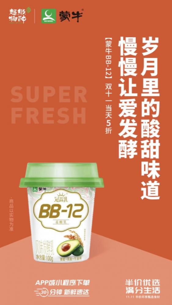 而在所有亮相的低温酸奶中,有一款产品不得不提,那就是首款以菌种命名的功能性酸奶——冠益乳BB-12!而作为开启了功能性酸奶新时代的标志之作,这款酸奶最特别的地方在于添加了丹麦进口菌BB-12。该菌种的活性远超普通益生菌,具有有效提升免疫力,调节肠道功能,改善消化健康等功效。以五折的价格就可以把这款活菌酸奶带回家,蒙牛有格青年可谓在超级物种引领了双十一酸奶的新“食”尚!