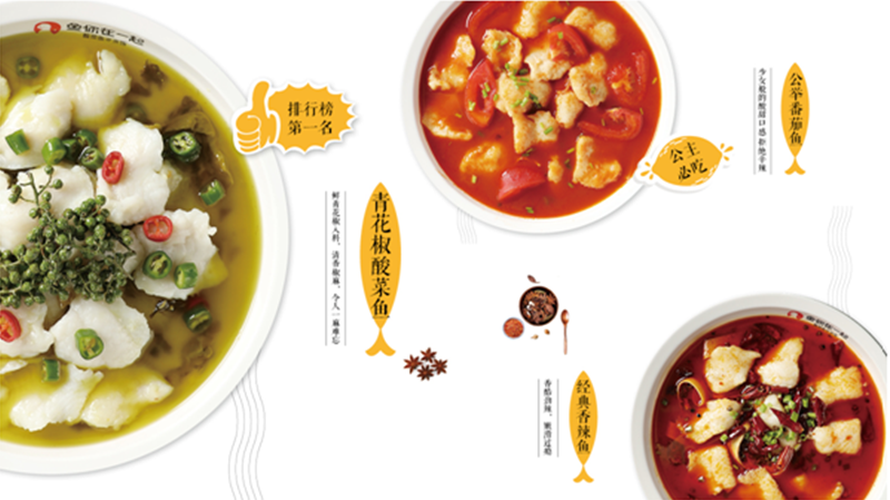 所以,“鱼你在一起”虽然只是酸菜鱼,但却研发了多种口味,这样不仅满足年轻人对酸菜鱼各种口味需求,同时能很好的在他们心目中形成酸菜鱼单品快餐印象记忆。青花椒酸菜鱼、老坛酸菜鱼、金汤酸菜鱼、香辣酸菜鱼、剁椒酸菜鱼、番茄公举酸菜鱼等等,多种口味,能满足不同人群对不同口味的需求。