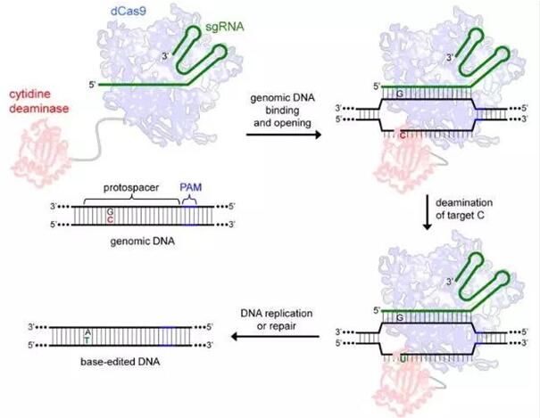 2016年,华人科学家David Liu领导的课题组率先开发胞嘧啶编辑器(CBE),实现了C-to-T的点对点基因编辑。该编辑器由dSpCas9与APOBEC1脱氨酶的N末端融合而成,前者含有Asp10Ala和His840Ala突变,失去核酸酶活性,但保留了以gRNA引导结合DNA的活性;后者是一种胞嘧啶脱氨酶,可以催化胞嘧啶(C)脱氨生成尿嘧啶(U),之后通过DNA复制或修复尿嘧啶(U)被转换成胸腺嘧啶(T)。最终的结果就是G-C碱基对被成功转换为A-T碱基对。