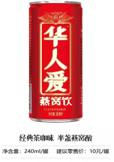 在今年秋季糖酒会亮相了一款可以“喝”的燕窝饮——华人爱,就是一款化繁为简的“便利饮料”。它不仅把燕窝变成饮品,省去一切泡发、炖煮的繁琐程序,让消费者可以开盖即饮;还富含燕窝精华,每罐所含的燕窝酸约就相当于半盏小燕窝。华人爱凭着所倡导的健康、高品质、好口感的消费理念,给注重健康追求品质生活的消费者带来不一样的新体验。重要的是,华人爱的售价仅为10元,这让该产品一经推出,立刻受到了众多消费者的关注和追捧。