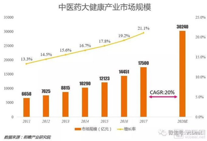 在过去7年间,我国中医药大健康产业的市场规模持续上升,保持两位数的高速增长。在2017年,已经达到17500亿元,同比增长21.1%。根据国务院新闻办发布的《中国的中医药》白皮书,至2020年,我国中医药大健康产业将突破3万亿,年均复合增长率将保持在20%。