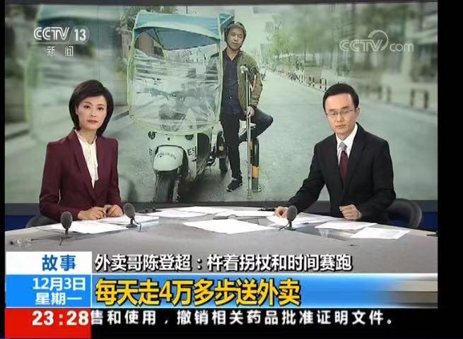 12月3日国际残疾人日,央视新闻频道晚间新闻用12分钟大篇幅报道了单腿小哥陈登超送外卖撑起一个家的感人事迹;12月4日,央视新闻官方公众号《单腿小哥送外卖,每天4万步,这份坚强让人泪目!》,对陈登超进行专题报道; 12月5日早8点,人民日报头条也对陈登超的报道进行了转载。