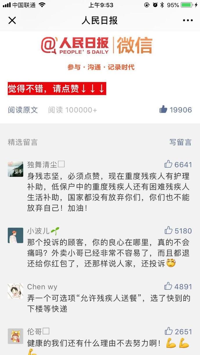 媒体报道后,不少网友被陈登超的精神鼓舞:“单腿送外卖非常艰苦,为了家人努力奋斗,值得点赞!” ”面对生活的磨难还能如此乐观坚强,真的受到了很大鼓舞。”又燃起了我生活的斗志,我们还有什么理由不努力!”