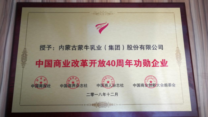 12月11日至12日,在中国商业改革开放40周年纪念大会上,蒙牛以19年的快速发展以及对行业转型创新发展所做出的重大贡献,获得“中国商业改革开放40年功勋企业”称号。