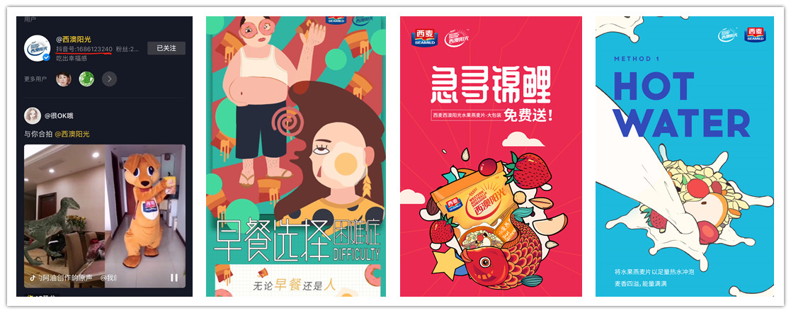 作为线上营销的“三驾马车”,微信、微博以及抖音如今已成为产品露出的有力渠道。西麦西澳阳光水果燕麦片在线上平台的传播过程中,摒弃了传统的简单粗暴的信息轰炸模式,转而采用生动新颖的长图文、GIF海报、互动小游戏、抖音开屏及抖音挑战赛小视频等方式进行线上传播,吸引了大批以年轻上班族为主的目标受众。