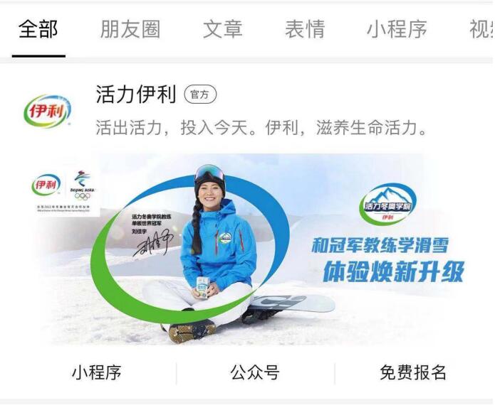 当下正逢雪季,滑雪俨然成了朋友圈的热门话题。为了收割精准流量,此次伊利除了将自身品牌及活动名称作为搜一搜的关键词外,还抢占了“滑雪”这一极具时效性的IP热词(这也是快消行业在“搜一搜”尝试的第一个IP类词),将那些有滑雪计划或兴趣的目标用户引导至其品牌官方区,继而了解活力冬奥学院的报名活动。