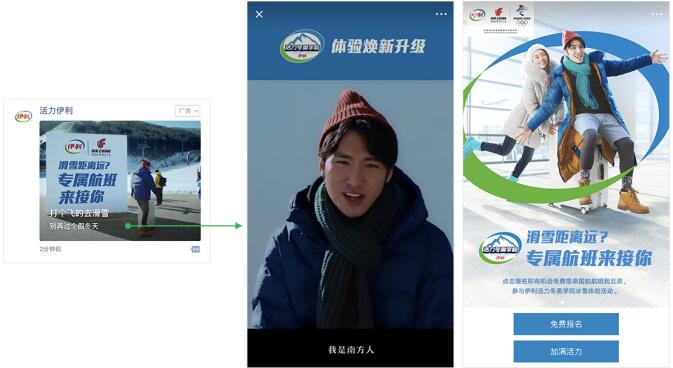 为全面推广“活力冬奥学院2.0”, 12月3日伊利上线了朋友圈广告。以直白明了的文案“打个飞的去滑雪,别再过个假冬天”,配合现场亲临感十足的全幅式卡片广告,吸引用户关注点击。