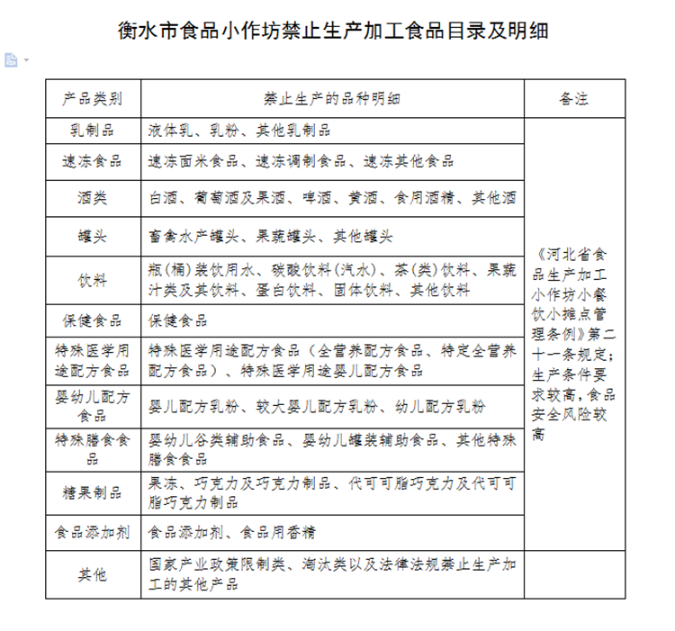 衡水市食品和市场监督管理局发布《食品小作坊禁止生产加工食品目录及明细》,图为衡水市食品小作坊禁止生产加工食品目录及明细表。(衡水市食品和市场监督管理局供图)