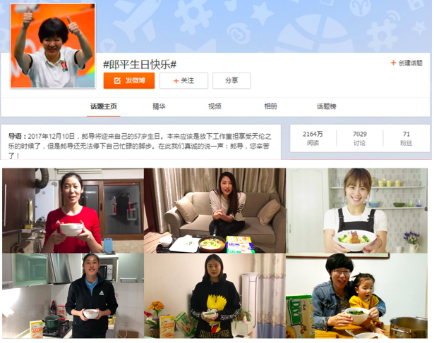 该事件在微博等线上平台形成话题发酵,仅“郎平生日快乐”的话题页就收获2327万次曝光。很多粉丝们也都参与行动起来,在线上自发组织起为郎平做一碗好吃的生日面。平日生活,或者征战比赛郎导也经常会吃上一碗,说是吃面也能带来好的寓意。