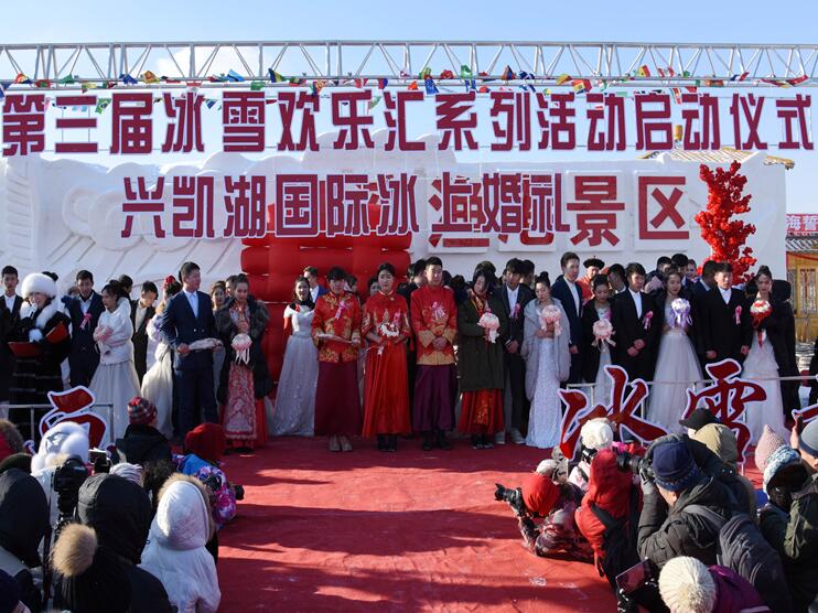 本网讯(孙云阁 范士友 高伟)12月23日,由鸡西市委市政府主办,由密山市委、市政府,兴凯湖管委会、市文体广电和旅游局承办,由黑龙江兴凯湖国际旅游开发有限公司、兴凯湖湖湾渔港协办的密山第二届兴凯湖国际冰上集体婚礼暨鸡西市第三届“冰雪欢乐汇”赏冰乐雪活动在千里冰封的兴凯湖举行,30对新人在兴凯湖许下一生的承诺,喜结伉俪。