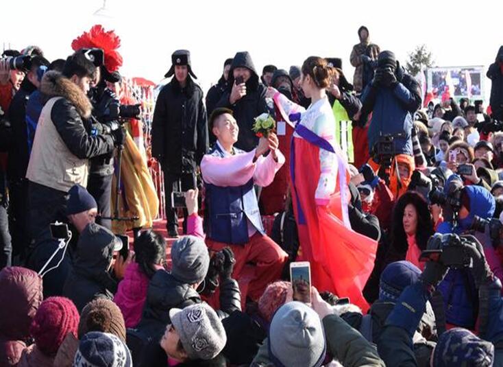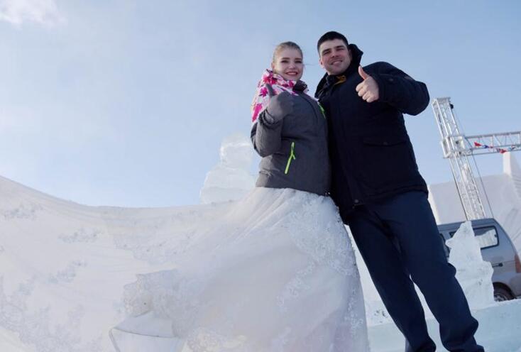 来自沈阳市的新郎张子健、新娘杨洋,在央视上看到密山市“水陆空”的独有魅力,怀揣着“密山、蜜水、觅亲人,我在密山等您来”的邀请,来到荣获“优秀中国魅力城市”的密山市旅游,正值婚期,正好听到密山举办第二届兴凯湖国际冰上集体婚礼的消息,便决定在兴凯湖上举办婚礼,而今,圆了一对新人的梦想。长春市新郎王宏宇、新娘李晴接到兴凯湖冰上婚礼的邀请,专程来到密山举办露天、自然、冰雪婚礼。