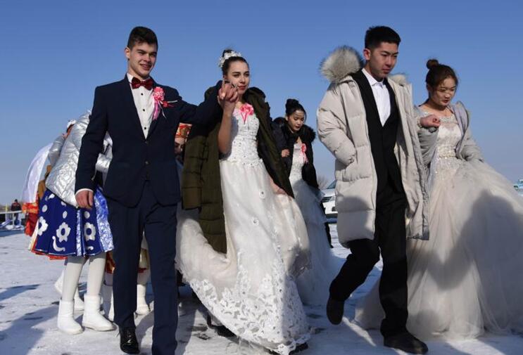 婚礼现场,中俄+婚礼,让在场的中俄“娘家人”喜出望外,赞不绝口。来自海参崴、乌苏里斯科、卡缅的六对新人,在中俄界湖兴凯湖、以冰雪为舞台,举行别出心裁的婚礼。兴凯湖的东北风和着唢呐,和着礼炮,为30对新人喝彩,送去人与大自然合成的婚礼交响曲。