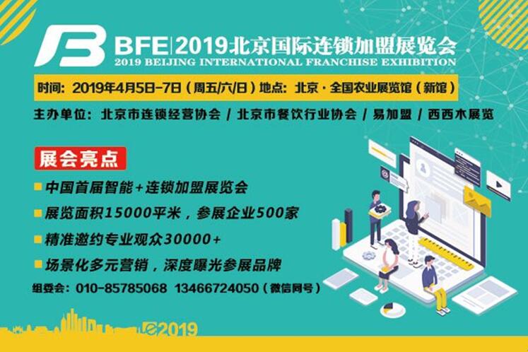 由北京市商务委员会批准,北京市餐饮行业协会、易加盟携手西西木展览承办的“BFE2019北京国际连锁加盟展览会”将于4月5-7日在北京全国农业展览馆举行。展会展品涵盖餐饮食品、教育培训、加盟服务、品牌加盟、美容健身、科技成果、医疗保健、金融理财、有机绿色食品等九大类,500个加盟项目、50000余创业投资精英汇聚展会。