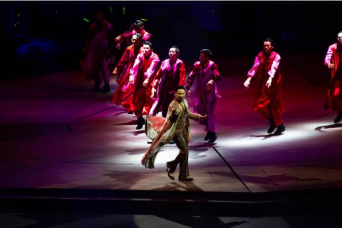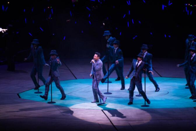 以《我与你》作为开场曲,张学友率24位舞者热力演出歌曲,升降舞台堆叠出蛋糕形状,舞群双双对对的展现浪漫圆舞曲,张学友穿梭在舞台间,蛋糕台旋转后一秒变阶梯,他时而上楼时而下楼,穿梭于华丽舞群中,宛如一场百老匯音乐剧大型歌舞表演。瞬间把现场歌迷拉回了那个时代,掀起了一片高潮。