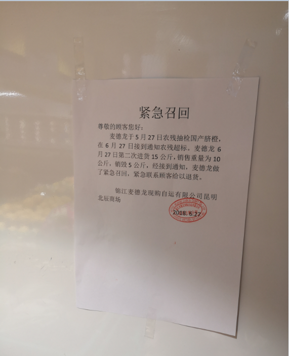 (二)昆明市盘龙区市场监管局对锦江麦德龙现购自运有限公司昆明北辰商场实施现场检查情况及依法采取的查封扣押等措施如下:1、责令企业停止销售不合格茂谷柑,并下达《责令整改通知书》。2、现场调查该批茂谷柑已经全部销售完毕,我局执法人员要求该商场粘贴召回公告。