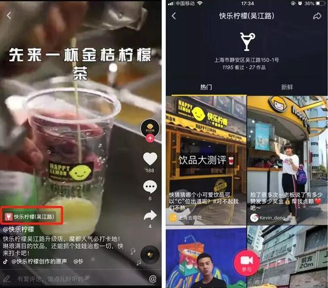 作为最近大热的短视频平台,抖音一直是流量的聚集地,从抖音火起来的各种网红餐厅和网红吃法不计其数,以第一人称视角发现各种美食,如临其境,大众很容易融入其中。海底捞,CoCo,答案茶就是成功的抖音带货案例。快乐柠檬上线抖音蓝V后,门店浏览量高达37W,带动合作门店总营业额上涨70%。
