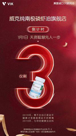 距离VIK(威克)纯南极磷虾油青岛002号旗舰店开业还有3天,2019年1月1日,来青岛金狮广场百盛精品超市,到店还有新年最强福利等你拿,挑选最贴心的健康好礼带回家吧!