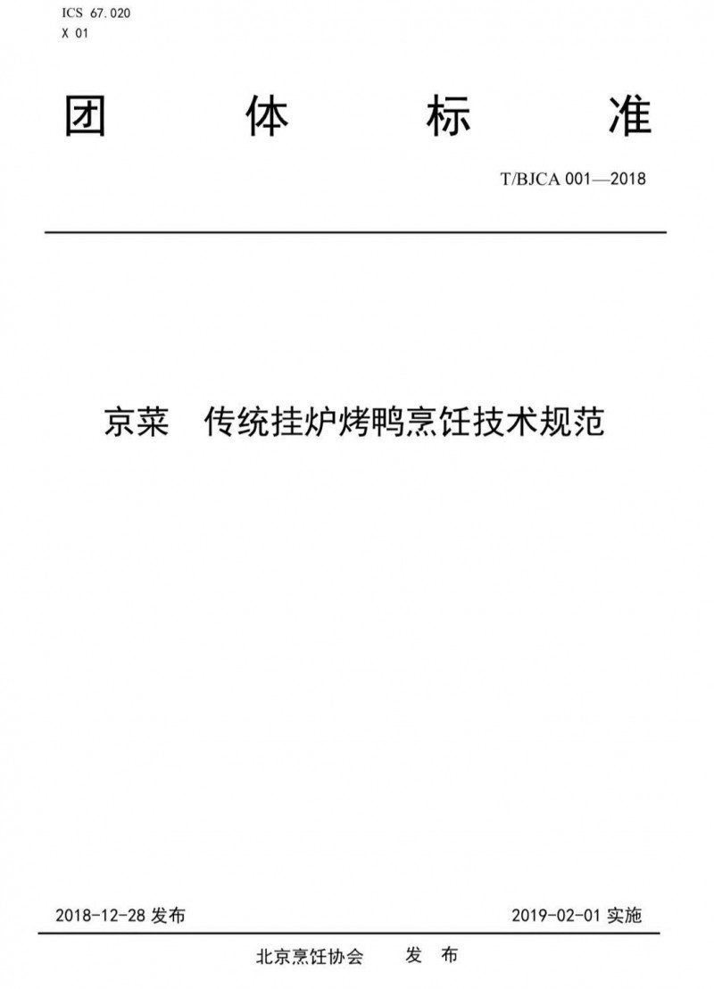 《京菜传统挂炉烤鸭烹饪技术规范》和《京菜 传统焖炉烤鸭烹饪技术规范》的团体标准由北京烹饪协会名厨专业委员会起草,对挂炉、焖炉烤鸭的术语和定义、原辅材料及要求、烹饪器具、制作工艺、装盘成型及食用方式、质量要求等方面做出了具体规定。这是北京市餐饮行业内首个针对京菜传统挂炉、传统焖炉烤鸭烹饪技术规范的团体标准。