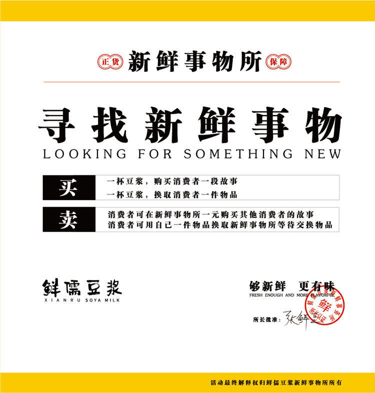 鲜儒豆浆不仅是一家有“夜豆浆”的独特文化,它还是一家有故事的豆浆店,在这里,鲜儒豆浆的消费者可在新鲜事物所一元购买其他消费者的故事,消费者也可用自己一件物品换取鲜儒新鲜事物所等待交换物品,鲜儒豆浆通过视觉方式卖情怀在市场上收获忠实粉丝,这样的用户粘性可是那些促销型餐厅无法比拟的。