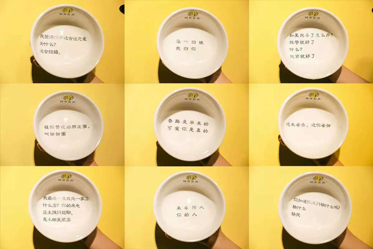 此外,鲜儒豆浆喝到见底的时候,还会意外地被碗底的“土味情话”撩到!这设计也是很用心,每次把豆浆一饮而尽的时候,都会被撩的猝不及防。、