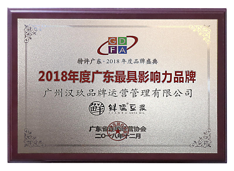 除此之外,鲜儒豆浆还获得了广东省连锁经营协会的高度认可,在第八届广东特许经营发展大会上,荣获“2018年度广东最具影响力品牌”!更值得一提的是,鲜儒豆浆总部汉玖餐饮集团经过多年的创新发展,公司先后荣获“广州食品行业协会理事单位”、“广东省餐饮服务行业协会理事单位”等荣誉称号,成为餐饮企业龙头企业之一。