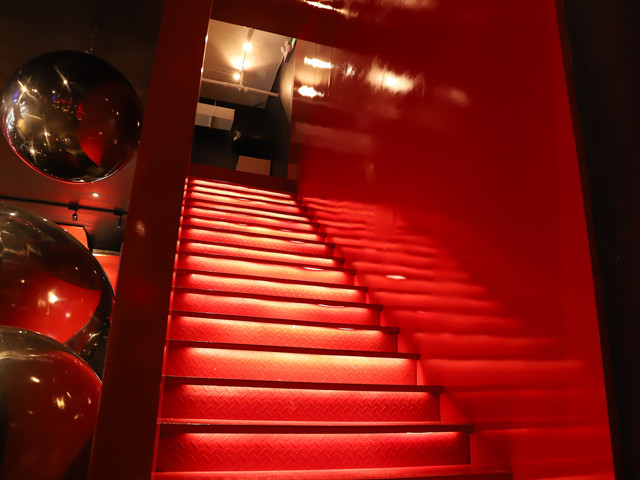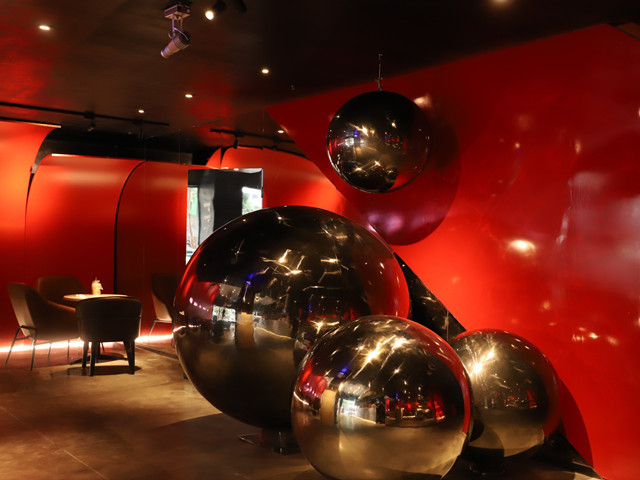 而红鲜红曲面墙面设计,加上不锈钢背发光LOGO字体和激光投影,光暗的线条充分地体现网红潮流特质