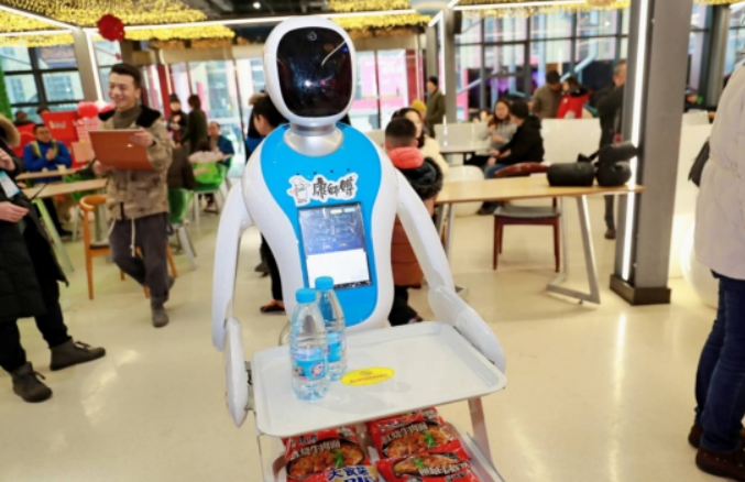 ▲AI机器人化身服务员穿梭在人群中,为大家提供暖心服务