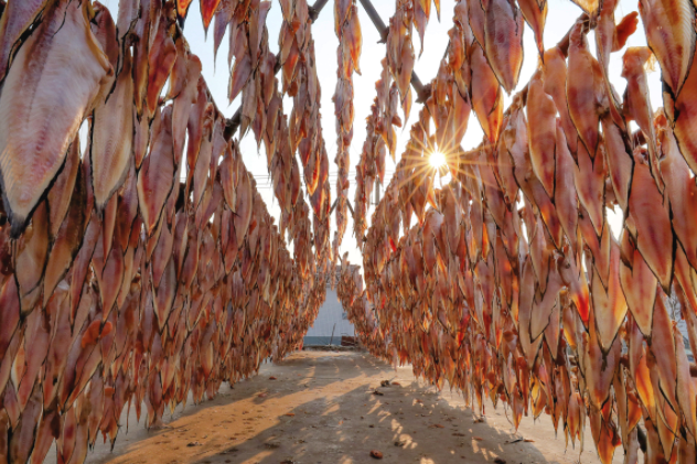 寒冬时节,天气晴好,江苏省连云港市沿海渔民忙着将捕获的鱼类晾晒成鱼干供应年节市场。一排排、一串串的鱼干在阳光下熠熠生辉,成为冬日沿海一道美丽的风景,浓浓的年味扑面而来。