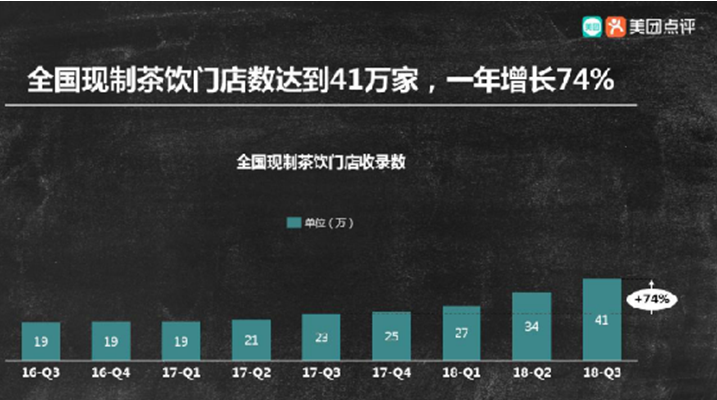 近年来,国内饮品市场火热,特别是茶饮行业发展日新月异,无论是消费者还是加盟商需求都很大。根据美团点评发布的《2019中国饮品行业趋势发展报告》显示,2018年我国的茶饮市场全面爆发,截止到2018年三季度,全国现场制作的茶饮门店数达到41万家,一年内增加了74%。新的增长主要来自消费者对常规饮料的替代,和消费群体对健康茶饮的需求。