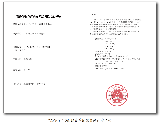 到了青少年时期经常补充3A能够有效改善记忆力。青少年学生,学习时期很需要加强脑细胞的功能,忘不了3A脑营养胶丸能促进脑细胞的发育,从而明显地改善记忆能力。在学习生活中,补充 3A可以帮助脑细胞建立更多的突触联系,从而有利于脑细胞间信号的传导和处理,提高记忆、思维能力,消除大脑疲劳,从而提高学习效率。值得注意的是,忘不了3A 脑营养胶丸是天然海洋营养补品,其功效成份 3A(即 DHA、EPA、DPA)皆为 N—3 型多烯脂肪酸乙酯(PUFA),是日常膳食中难以摄取的脑营养物质,以海洋鱼油为原料,禹王制药针对青少年学生的需要,采用美国国际天然药物公司(NPI)专有配方,在 GMP 车间运用现代先进物理分子蒸馏工艺技术提取、精制而成。注意:批准文号:卫食健字(1997)第 084 号。GMP :是指国际上对《药品生产质量管理规范》的通称。