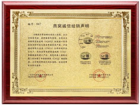 为推进社会信用体系建设,增强燕窝经销商诚信意识,促进对外贸易健康发展,结合燕窝溯源管理服务工作,中国检验检疫科学研究院CAIQ发起了“燕窝诚信经销声明”活动,旨在由企业做自我诚信声明,保证所有干燕窝都有码可溯源,并欢迎社会各方监督。此次参之源被授予“燕窝诚信经销声明”牌匾,标志着参之源正式加入国内燕窝品牌相互监督、共同发展的正规军,自觉接受社会各界监督。