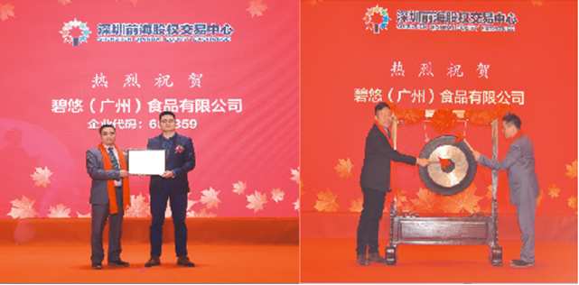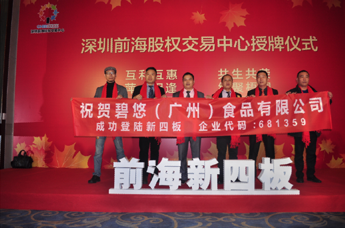 12月13日下午,碧悠(广州)食品有限公司在资本中国基地支持下,成功登陆深圳前海股权交易中心举行新四板挂牌仪式。碧悠(广州)食品有限公司创始人、总经理、股东代表以及公司高层管理人员参加了本次仪式活动。在紧张庄严的氛围中,碧悠(广州)食品有限公司创始人谭林先生接过深圳前海股权交易中心的授牌,在全场嘉宾的祝福与期待中,两位企业代表同时敲响上市锣钟,为企业开启新起点。
