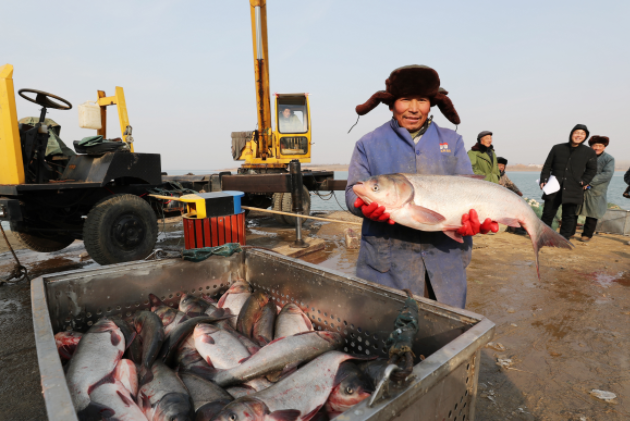 春节临近,江苏省连云港市赣榆区进入冬捕忙碌时节,渔民捕捞鲜鱼,供应市场。近年来,江苏省连云港市赣榆区坚持环保优先政策,采取一系列优惠措施,鼓励引导农民发展无公害淡水鱼养殖,带动当地渔民增收。目前,江苏省赣榆区拥有无公害淡水产养殖面积26万余亩,年产鲢鱼、鲤鱼、鲫鱼、黑鱼等淡水鱼43万吨。司伟 李隔 摄