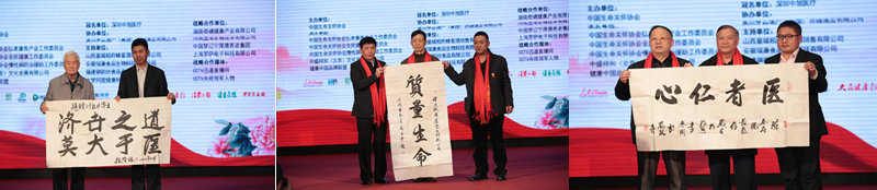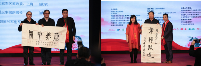 本次联谊会的召开,得到了国家相关领导、老部长、老将军的关注和支持,北京军区原政委符廷贵上将、原武警总部司令员吴双战上将亲自为本次联谊会题字,弘康委主任委员陶金海、秘书长郑连胜、慢病委秘书长盛燕、中旭医疗董事长卓珈辉上台接受了墨宝!孙隆椿部长、尚全孝将军、李春明将军也分别献了墨宝。