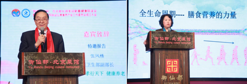 接下来的环节是联谊会开幕式主题报告,原卫生部副部长张凤楼为大家作了“孝行天下,健康养老”主题报告。中国疾病预防控制中心营养评价室主任、中国营养学会理事长杨月欣教授为大家作了“生命养护和健康老龄化”主题报告。