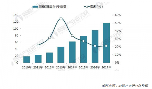 相关数据显示,2017年我国营养保健食品的进口额为21.9亿美元,同比增长42.2%,进口产品主要来自美国、澳大利亚、德国等。其中,美国稳居前列,年销售额超过百亿人民币,复合年均增长率超过30%,增长规模不断扩大。