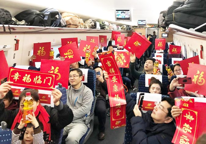 2号车厢的乘客赵先生在活动当天正逢生日,福临门与全列车乘客一起为赵先生过了一个难忘的生日,并送上了特殊的生日礼物。“刚上车看到是‘福临门号’就格外惊喜,这个寓意特别好;2019年开门红,收获了满满的福气!”赵先生难掩激动之情。大学生小岑今天放假回家,“看到小桌板上写着‘快一点,再快一点,别让接站的他等太久’,就跟我此刻的心情一样,真是太感动了。正好把福临门油和这份福字春联带给爸妈,有家就有福临门。”