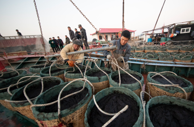 1月22日,养殖户在江苏省连云港市赣榆区青口渔业码头,将刚收割的新鲜紫菜卸船装车运往加工厂。近日,我国紫菜主产区江苏连云港沿海20余万亩条斑紫菜进入收割高峰期,紫菜养殖户抓住晴好天气抢收。
