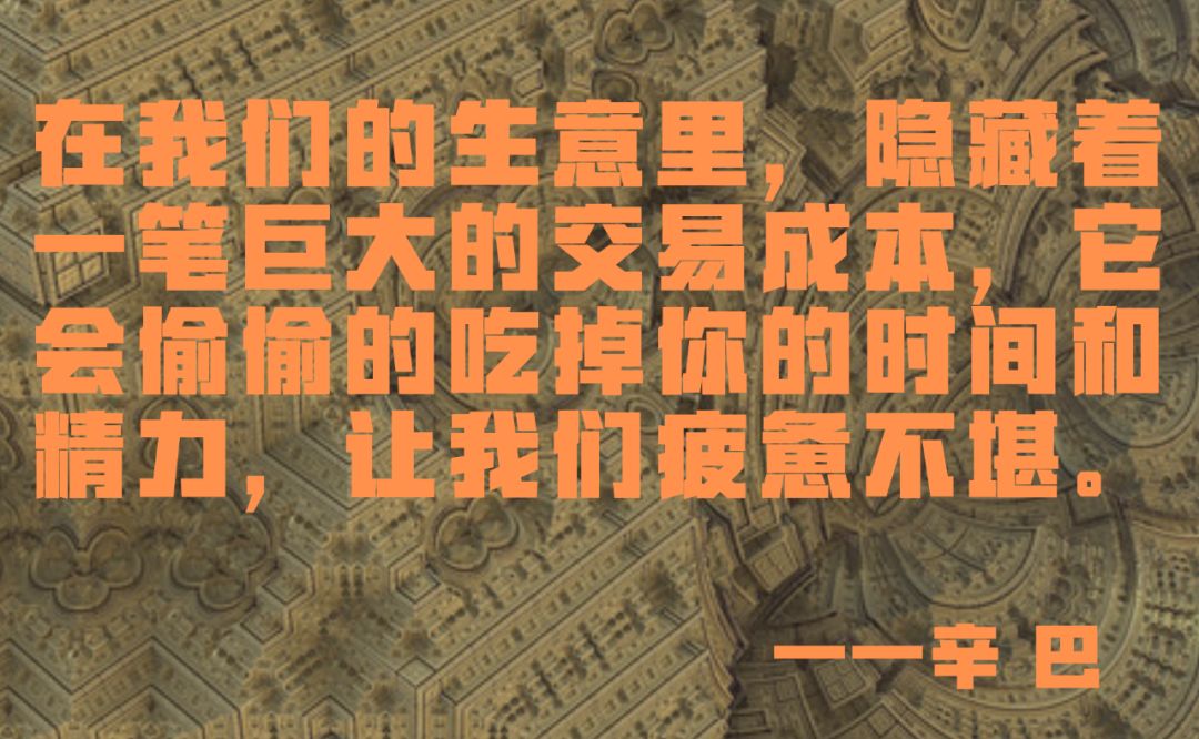 北京居民吃到一个苹果,至少需要四级渠道才能买到。每个层级的交易都将是一场关于信用和价格的谈判,在整个交易链中,我们至少增加了四项隐性的交易成本: 四项隐性成本 1、信息成本。获取上游供应信息的成本,比如从付费网站获取或熟人推荐等; 2、信用成本。为确认TA是一位靠谱的供应商,所付出的时间和精力投入; 3、谈判成本。为确认“货真价实”所付出的各项成本,比如商务考察、价格谈判等; 4、政策成本。政策变动导致的成本浮动等; 以上四点构成了我们看不见摸不着的交易成本。 如何理解交易成本?狭义上看,是一项交易所花费的时间和精力。有时这种成本会很高,比如当一项交易涉及不同地点的多个交易参与者时。广义上看,是协商谈判和履行协议所需的各种资源的使用,包括制定谈判策略所需信息的成本,谈判所花的时间,以及防止谈判各方欺骗行为的成本。