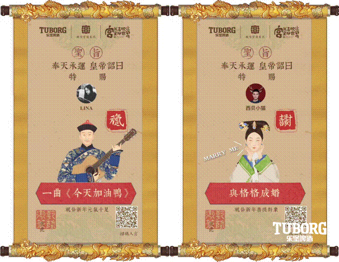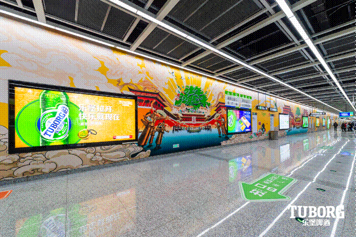 你是否有想过真的到故宫过大年?乐堡啤酒联手艺术工作室创作超大型年画,创造性地把宫廷过年的场景搬到了广告上,线下真实还原清宫春宴巨幅年画,选择在全国范围内进行地铁、灯箱、候车厅等多维度线下投放,尤其是在重庆、贵阳、成都三地的包站轰炸,长达14个地铁车厢的超长画卷, 1510平方米的视觉全方位包围,盛大的潮年气氛透过广告屏铺面冲击路过行人,画面色彩鲜艳并充满各种细节彩蛋,吸引众多潮人纷纷自拍打卡。