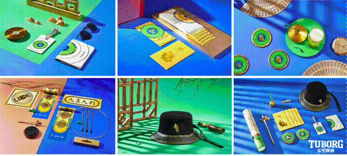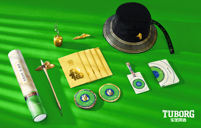 回到具体的创意表现上,从产品能窥见一二。乐堡啤酒在选用深受年轻人喜爱的专属潮流色「春光绿」、「电光蓝」基础上,同时把故宫专属元素融入到产品当中,这种突破传统春节大红大紫色彩的蓝绿色设计,完全跳脱出年的俗套,就像春节里的一股“清流”。乐堡啤酒还为这些周边都赋予特别有趣的含义,每件产品不仅有文化底蕴还有潮流趣味,例如「红包在手,福气我有」,「对联一挂,全年开挂」,「奉旨出巡,周游四方」,「头顶大事,奉旨变潮」,乐堡啤酒还专为畅饮啤酒的青年设计了五福临门系列杯垫,皇帝福字庇佑,新年欢聚喝乐堡啤酒,「事半功杯,垫石成金」。
