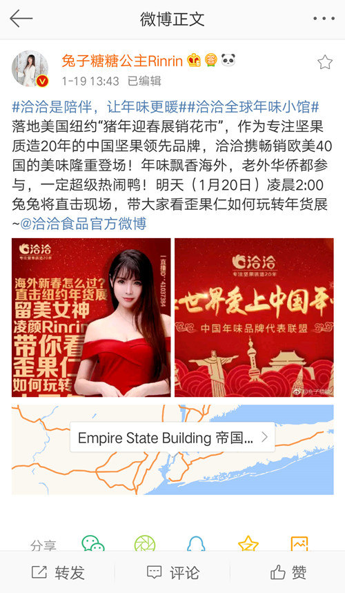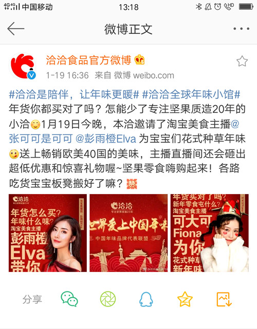 在年味小馆落地纽约前,洽洽在微博联合直播红人发布直播预告,看外国人嗑瓜子、玩转年货展、2019年新年零食……各种话题不胫而走,吊足了粉丝胃口。而后国内联合淘宝直播,强力种草新春年货;海外登陆一直播,直击纽约“猪年迎春展销花市”现场盛况;微博大V扩散分享,扩大影响全民围观。