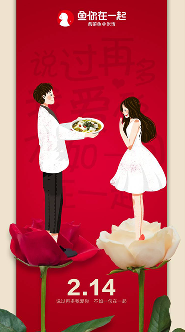二、鱼你在一起酸菜鱼。这两年十分火爆的酸菜鱼爆款品牌,由于其名字寓意非凡,以及店面十分符合年轻人的审美需求,所以“鱼你在一起”也就成为情人节关注的焦点。