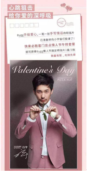 三、必胜客。在这波情人节营销中,必胜客捧出了白宇,并打出“这个情人节,白宇陪你过”的宣传语。几款套餐都带有白宇的“宇”字,并选部分顾客送出白宇明信片一张。