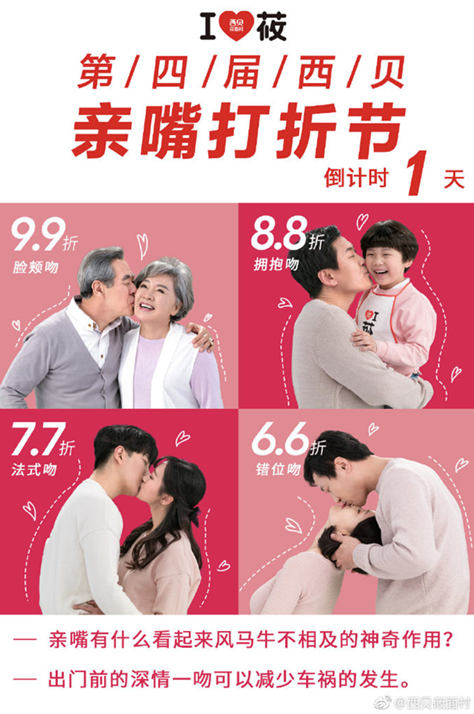 四、西贝莜面村。和往年的情人节玩法一样,继续推出“亲嘴节”。今年,已经是西贝第四届“亲嘴节”,继续“亲个嘴、打个折”。四种亲法,错位吻66折、法式吻77折、拥抱吻88折、脸颊吻99折。